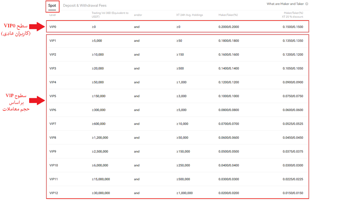 کاهش هزینه معامله، به سودآوری بیشتر در بلندمدت کمک میکند. بنابراین، مقایسه قیمت تتر در صرافیها برای یافتن بهترین قیمت لازم است. صرافی XT، با برخورداری از یک ساختار کارمزد رقابتی و شفاف، فرصتی عالی برای معامله بهصرفه و ارزان تتر در بازارهای فیوچرز و اسپات را فراهم میکند. کارمزد معاملات در این صرافی را میتوانید با ارتقاء به سطحVIP ، نگهداری توکن XT و افزایش حجم معاملات خود، کاهش دهید.