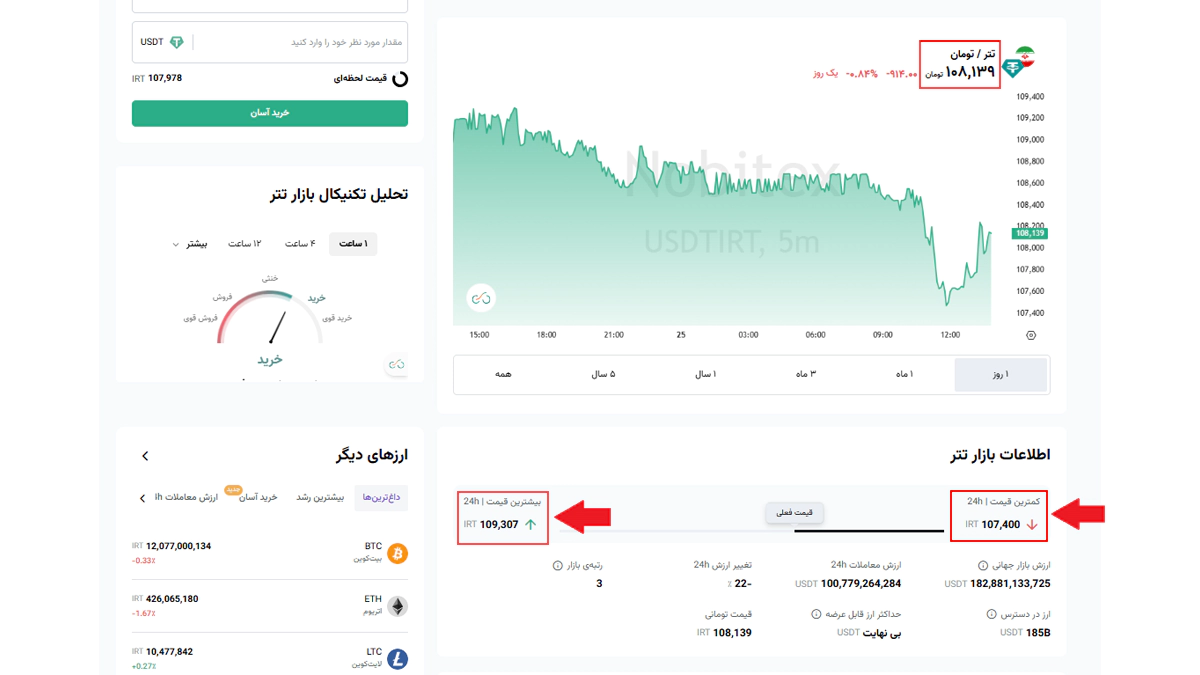 اما در مبحث مقایسه قیمت تتر در صرافیها باید گفت که قیمت تتر در نوبیتکس در زمان نگارش این مطلب 108,139 تومان است و همینطور در تصویر زیر نموداری از قیمت تتر در نوبیتکس مشاهده میکنید که کمترین قیمت آن در 24 ساعت گذشته 107,400 و بیشترین قیمت آن هم 109,307 تومان بوده است.