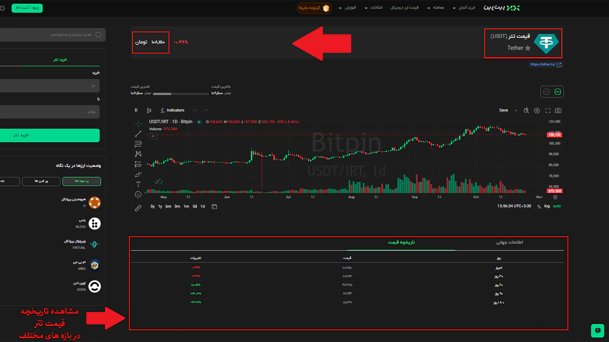بیتپین، یک صرافی ایرانی دیگر است که با ارائه کارمزد پلکانی بین 0.06 تا 0.32 درصد، به کاربران خدمات ارائه میدهد. میزان کارمزد خرید و فروش ارز دیجیتال در این صرافی، بر اساس میزان حجم معاملات و تراکنشها تعیین میشود. برای مشاهده و مقایسه قیمت تتر در این صرافی ابتدا وارد وبسایت این صرافی شوید سپس از منوی قیمت ارز دیجیتال، ارز تتر را انتخاب کنید. در این قسمت قیمت لحظه ای این صرافی را به شما نشان میدهد که در زمان نگارش این مطلب قیمت آن 108,150 تومان میباشد که در مقایسه قیمت آن در صرافی نوبیتکس، قیمت یکسانی دارد.