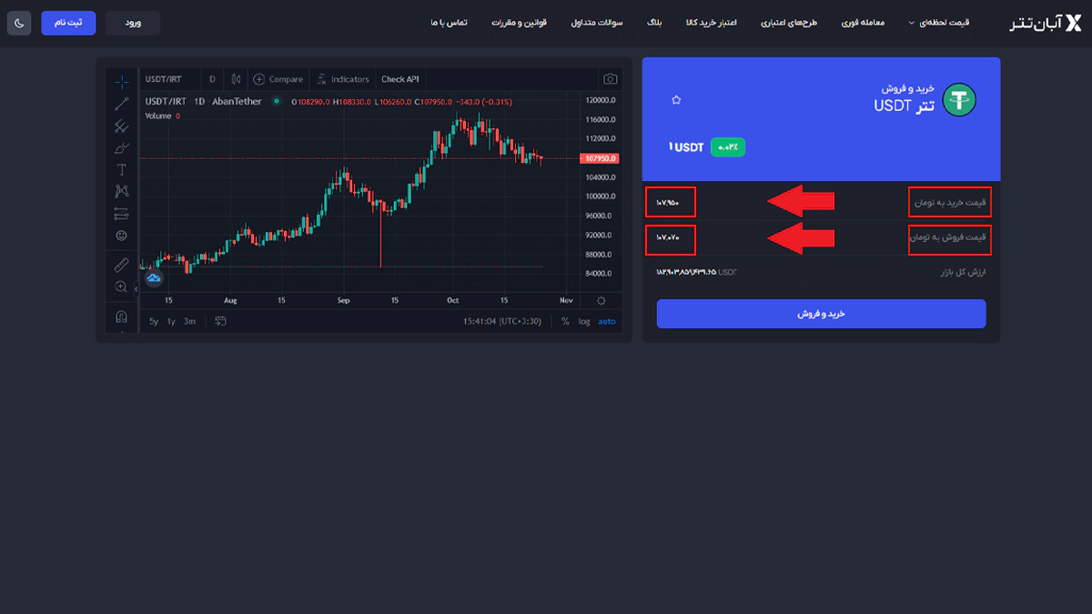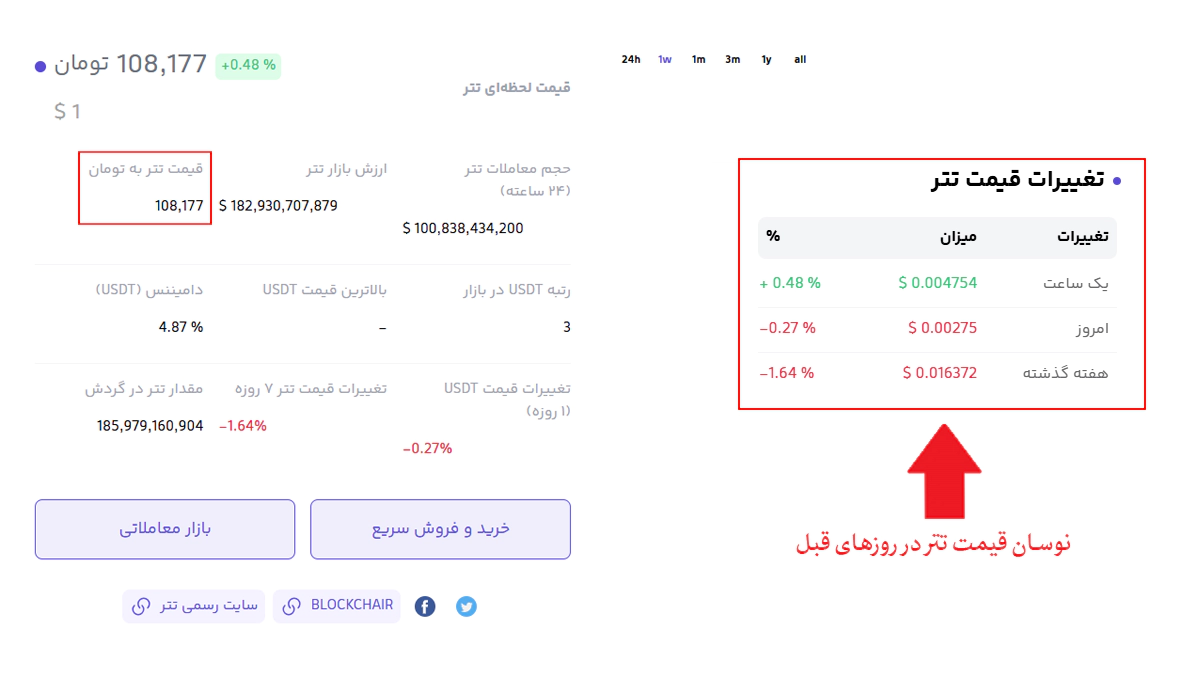 اوکی اکسچنج هم از دیگر صرافیهای ارز دیجیتال ایرانی است که در سال 1396 تأسیس شده و دارای 8 سال سابقه میباشد و همینطور به کاربران امکان خرید و فروش بیش از 700 ارز دیجیتال را میدهد. برای مقایسه قیمت تتر در صرافی اوکی اکسچنج، از وبسایت این صرافی منوی خرید و فروش ارز دیجیتال روی گزینه فروش و خرید تتر کلیک کنید. در این قسمت قیمت لحظهای تتر برای شما نشان داده میشود که قیمت آن در زمان نگارش این مطلب معادل 108,177 تومان میباشد. علاوه بر این تغییرات قیمت تتر از هفته گذشته تا امروز نیز در این صرافی قابل مشاهده است.